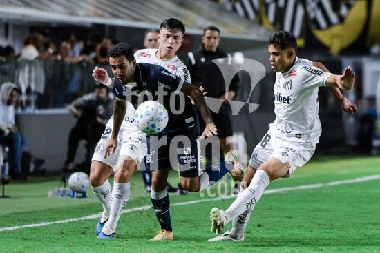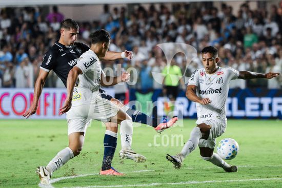 2917907 SANTOS, BRASIL - 02 DE ABRIL: Marcelinho do Remo (L), Alvaro Barreal do Santos (C) e Gustavo Henrique do Santos (R) durante o Santos x Remo - Brasileirao 2026 no Estadio Vila Belmiro em 02 de abril de 2026 em Santos, Brasil. (Marco Buenavista/Sports Press Photo / SPP)