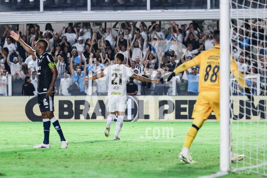 2917593 Santos comemora gol durante a partida entre Santos e Remo, válida pela 9ª rodada do Brasileirão, realizada na noite desta quinta-feira (02) no Estádio Urbano Caldeira, a Vila Belmiro, em Santos, SP.
