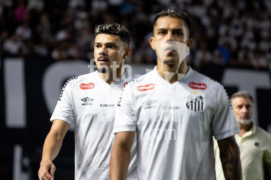 2879386 Elenco do Santos durante a partida entre Santos e São Paulo, válida pela 2ª rodada do Brasileirão, realizada na noite desta quarta-feira (04) no Estádio Urbano Caldeira, a Vila Belmiro em Santos, SP.