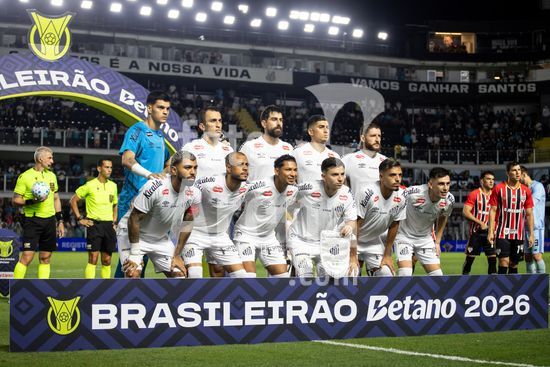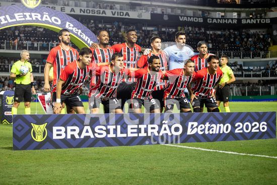 2879377 Elenco do São Paulo durante a partida entre Santos e São Paulo, válida pela 2ª rodada do Brasileirão, realizada na noite desta quarta-feira (04) no Estádio Urbano Caldeira, a Vila Belmiro em Santos, SP.