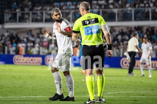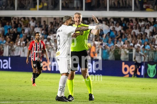 2879378 Gabriel Barbosa (Gabigol) discute om o árbitro Anderson Daronco durante a partida entre Santos e São Paulo, válida pela 2ª rodada do Brasileirão, realizada na noite desta quarta-feira (04) no Estádio Urbano Caldeira, a Vila Belmiro em Santos, SP.