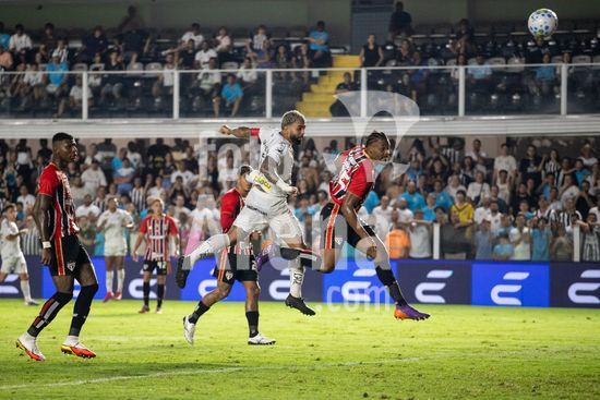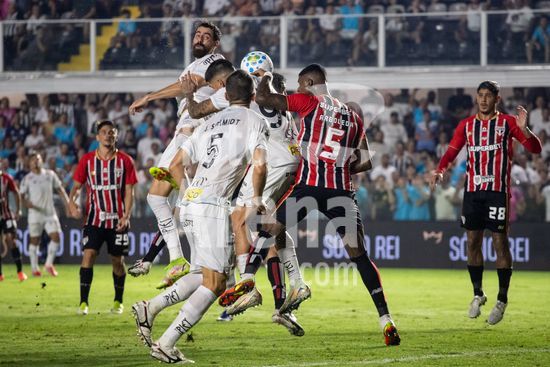 2879418 Lance aéreo durante a partida entre Santos e São Paulo, válida pela 2ª rodada do Brasileirão, realizada na noite desta quarta-feira (04) no Estádio Urbano Caldeira, a Vila Belmiro em Santos, SP.
