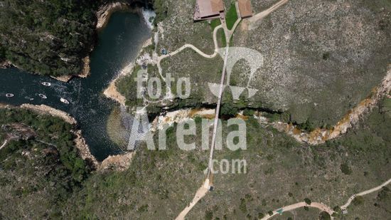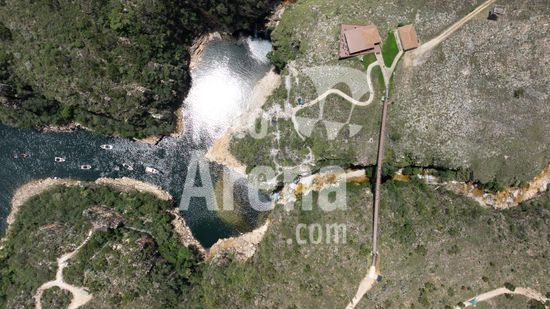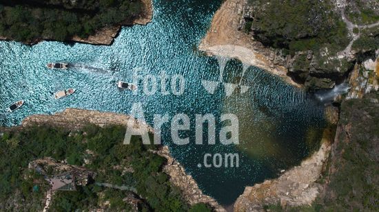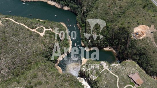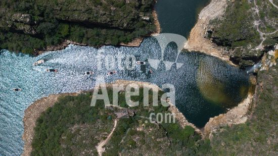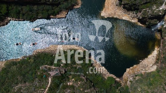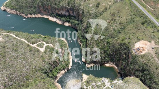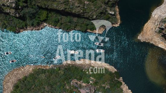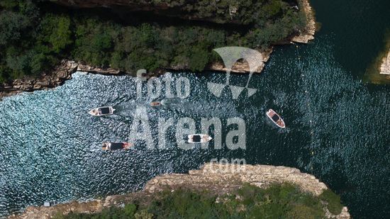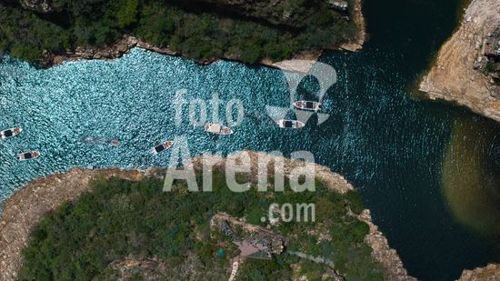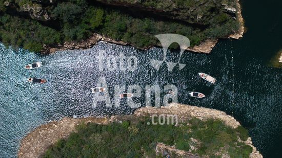 Uma imagem de drone mostra pequenas lanchas navegando no cânion seco da represa de Furnas, Interior de Minas Gerais. O lago conhecido como "mar de Minas" chegou hoje a 31% de sua capacidade. O Lago de Furnas, que abastece a represa hidrelétrica de Furnas, no interior de Minas Gerais e responsável por 17% da produção de energia no sistema da ONS, sendo um dos maiores do sudeste, e chegou a um dos mais baixos níveis para época do ano, considerado um período onde deveria estar acima de 50%. segundo site da ONS ( Operador nacional do sistema eletrico)