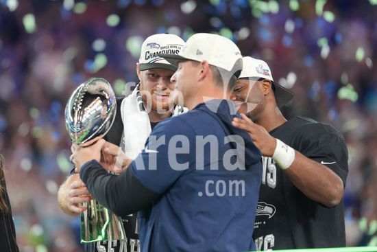 ny090226010112 Seattle Seahawks head coach Mike Macdonald, center, looks at the Vince Lombardi Trophy with quarterback Sam Darnold (14), left, and running back Kenneth Walker III (9) Ñ the Super Bowl MVP Ñ after the Seahawks won Super Bowl LX against the New England Patriots at Levi's Stadium in Santa Clara, Calif., on Sunday, Feb. 8, 2026. The Seahawks won 29-13. (Doug Mills/The New York Times/Fotoarena)