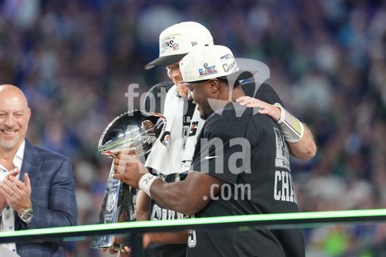 ny090226010111 Seattle Seahawks quarterback Sam Darnold (14), left, hands the Vince Lombardi Trophy to running back Kenneth Walker III (9) Ñ the Super Bowl MVP Ñ after the Seahawks won Super Bowl LX against the New England Patriots at Levi's Stadium in Santa Clara, Calif., on Sunday, Feb. 8, 2026. The Seahawks won 29-13. (Doug Mills/The New York Times/Fotoarena)