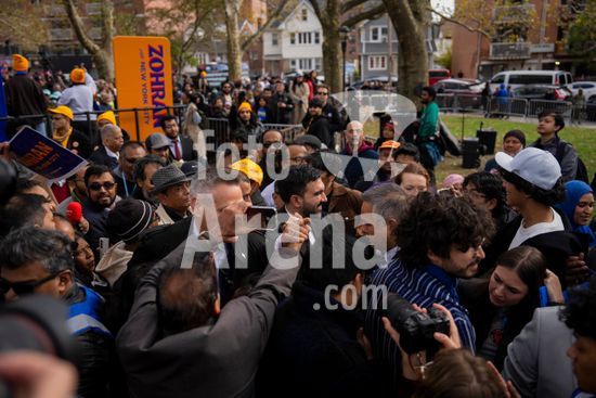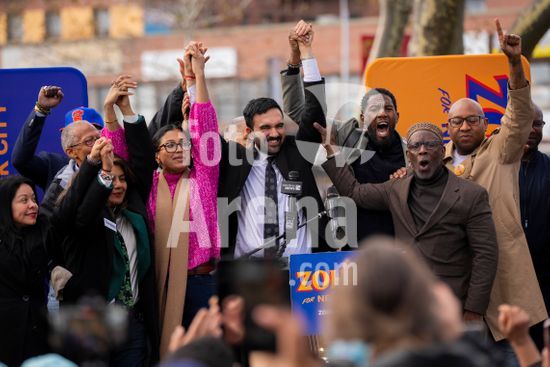 ny011125162811 State Rep. Zohran Mamdani, the Democratic nominee for mayor of New York City, raises his hands alongside various other elected officials after speaking at a canvassing event in the Jamaica neighborhood of Queens on Saturday, Nov. 1, 2025. With just two days of early voting left, New Yorkers continue to turn out in droves on the final weekend before Election Day. (Vincent Alban/The New York Times/Fotoarena)