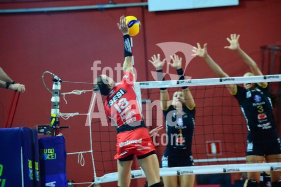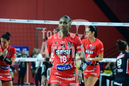 2867738 Partida entre Batavo Mackenzie x Sesi Bauru, aconteceu nesta segunda-feira (12), na Arena Batavo Mackenzie, em Belo Horizonte/MG. Jogadora do Sesi se preparando para o saque.