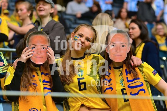 2927609 Strawberry Arena, SOLNA, SUECIA - 18 DE ABRIL: torcedores de Magdalena Eriksson antes da partida de qualificacao para a Copa do Mundo de 2027 entre Suecia e Servia na Strawberry Arena, em 18 de abril de 2026, em Solna, Suecia. (Peter Sonander/SPP)