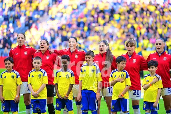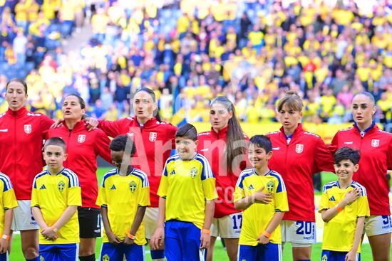2927610 Strawberry Arena, SOLNA, SUECIA - 18 DE ABRIL: Selecao servia durante a execucao do hino nacional antes da partida de qualificacao para a Copa do Mundo de 2027 entre Suecia e Servia, na Strawberry Arena, em 18 de abril de 2026, em Solna, Suecia. (Peter Sonander/SPP)