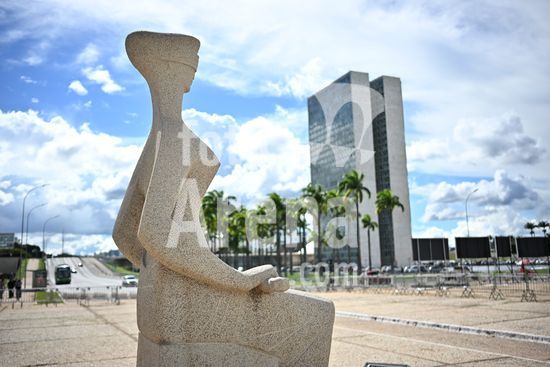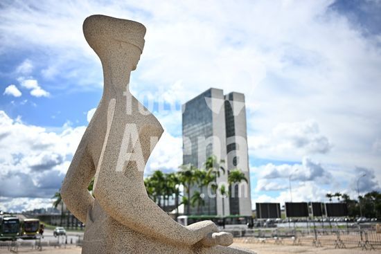 2911667 Foto, Estátua da Justiça e prédio do congresso. Nesta quarta (25) os ministros do STF iniciam a votação da suspensão do pagamento de penduricalhos no Judiciário, Legislativo e Executivo. Os ministros Flávio Dino e Gilmar Mendes suspenderam os pagamentos irregulares.