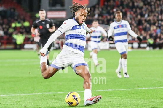 2838244 Rumarn Burrell (16 Queens Park Rangers) controla a bola durante a partida do EFL Sky Bet Championship entre Sheffield United e Queens Park Rangers em Bramall Lane, Sheffield, Inglaterra, em 8 de novembro de 2025. (Sean Chandler / SPP)