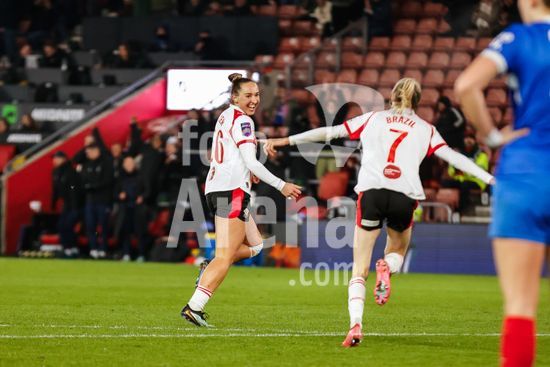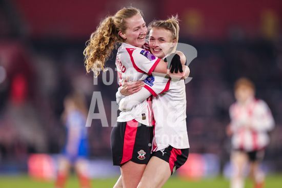 2867316 Ellie Brazil (7 Southampton FC Women) parabeniza Mary Bashford (14 Southampton FC Women) pelo seu gol durante a partida da Barclays Women's Super League 2 entre Southampton FC Women e Portsmouth Women, no St Mary's Stadium, em Southampton, Inglaterra. (Neil Holmes/SPP)