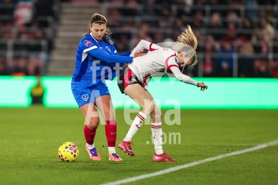 2867293 Annie Wilding (14 Portsmouth FC) e Megan Collett (23 Southampton FC Women) disputam a bola durante a partida da Barclays Women's Super League 2 entre Southampton FC Women e Portsmouth Women, no St Mary's Stadium, em Southampton, Inglaterra. (Neil Holmes/SPP)