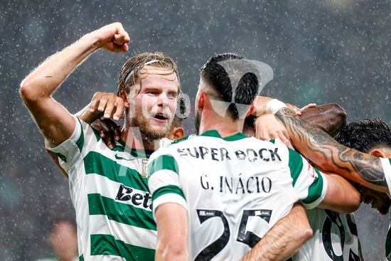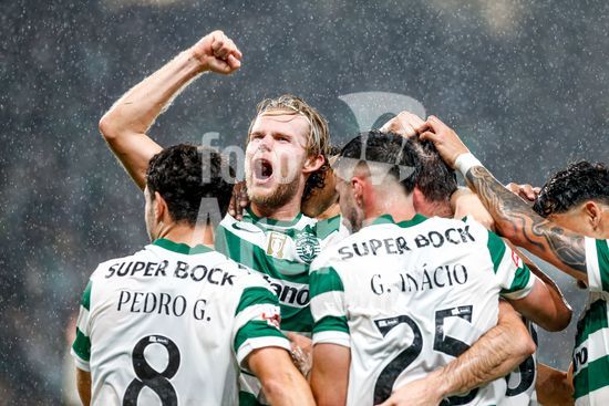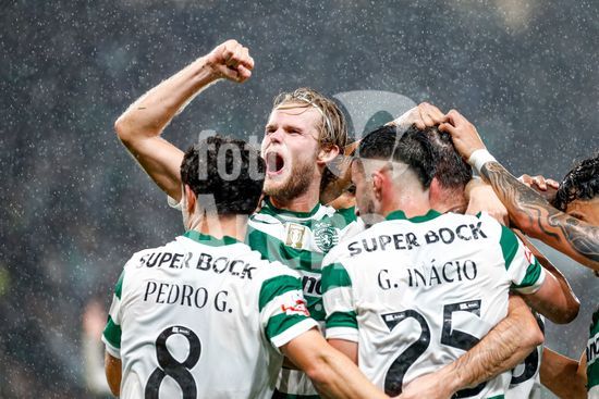 2833624 Fotis Ioannidis, avancado do Sporting CP, comemora depois de marcar um golo com Morten Hjulmand, medio do Sporting CP, durante o jogo da Liga Portugal Betclic entre Sporting CP e FC Alverca, no Estadio Jose Alvalade, em Lisboa, a 31 de outubro de 2025. Liga Portugal Betclic - Sporting CP vs FC Alverca (Valter Gouveia/SPP)