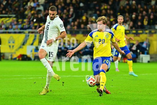 2844625 Gustav Lundgren (11 Suecia) e Erik Janza (13 Eslovenia) durante a partida das Eliminatorias da Copa do Mundo da FIFA, em 18 de novembro de 2025, entre Suecia e Eslovenia, na Strawberry Arena, em Solna, Suecia. (Peter Sonander/SPP)