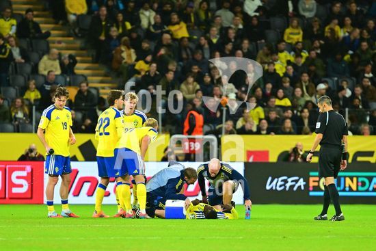 2844627 Ken Sema (13, Suecia) recebe atendimento medico durante a partida das Eliminatorias da Copa do Mundo da FIFA, em 18 de novembro de 2025, entre Suecia e Eslovenia, na Strawberry Arena, em Solna, Suecia. (Peter Sonander/SPP)