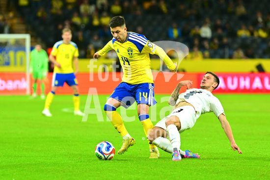 2844645 Gustav Lundgren (11 Suecia) e Jure Balkovec (3 Eslovenia) durante a partida das Eliminatorias da Copa do Mundo da FIFA, em 18 de novembro de 2025, entre Suecia e Eslovenia, na Strawberry Arena, em Solna, Suecia. (Peter Sonander/SPP)