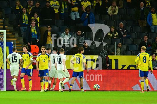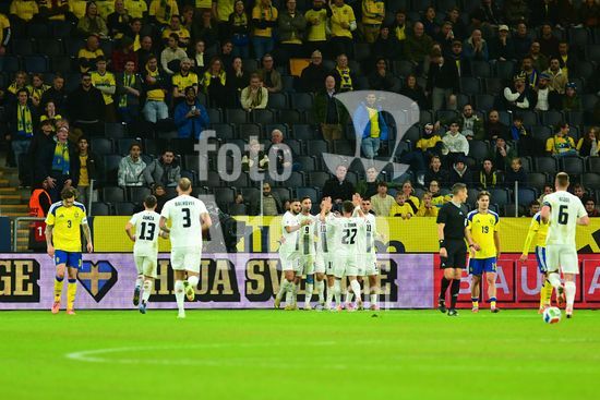 2844666 A Eslovenia comemora um gol enquanto a Suecia demonstra desanimo durante a partida das Eliminatorias da Copa do Mundo da FIFA, em 18 de novembro de 2025, entre Suecia e Eslovenia, na Strawberry Arena, em Solna, Suecia. (Peter Sonander/SPP)
