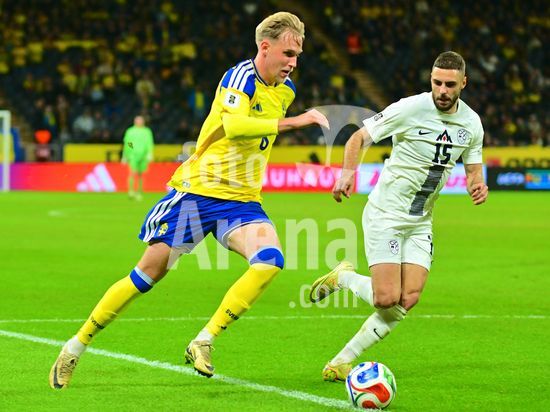 2844642 Roony Bardghji (14 Suecia) e Erik Janza (13 Eslovenia) durante a partida das Eliminatorias da Copa do Mundo da FIFA, em 18 de novembro de 2025, entre Suecia e Eslovenia, na Strawberry Arena, em Solna, Suecia. (Peter Sonander/SPP)