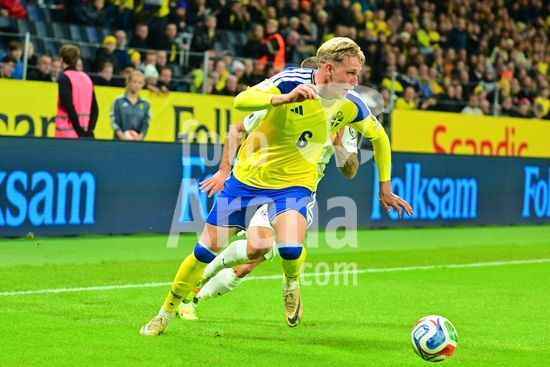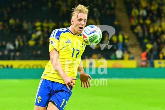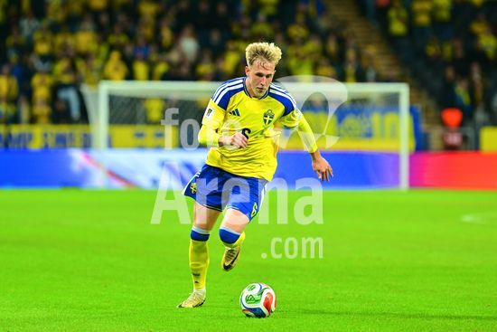 2844678 Herman Johansdon (6 Suecia) durante o jogo das Eliminatorias da Copa do Mundo da FIFA, em 18 de novembro de 2025, entre Suecia e Eslovenia, na Strawberry Arena, em Solna, Suecia. (Peter Sonander/SPP)