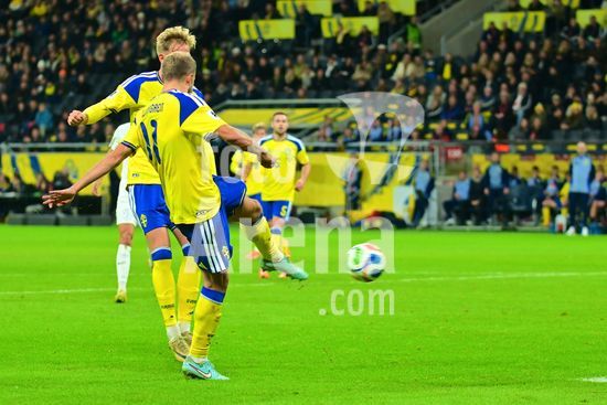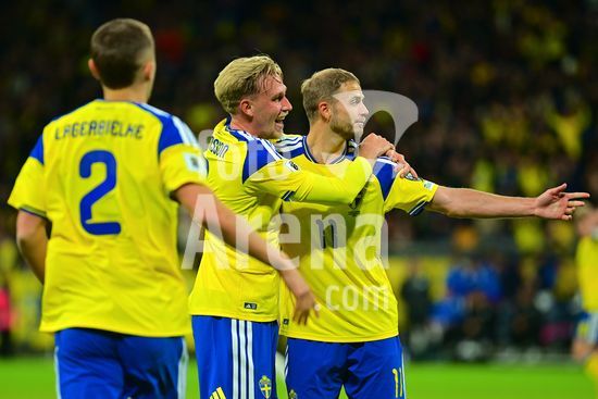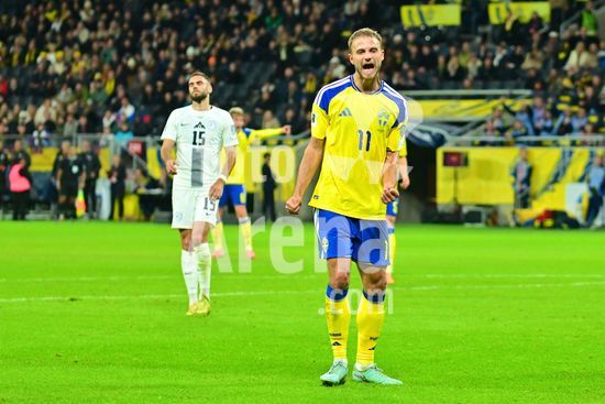 2844674 Gustav Lundgren (11 Suecia) comemora o gol na partida das Eliminatorias da Copa do Mundo da FIFA, em 18 de novembro de 2025, entre Suecia e Eslovenia, na Strawberry Arena, em Solna, Suecia. (Peter Sonander/SPP)