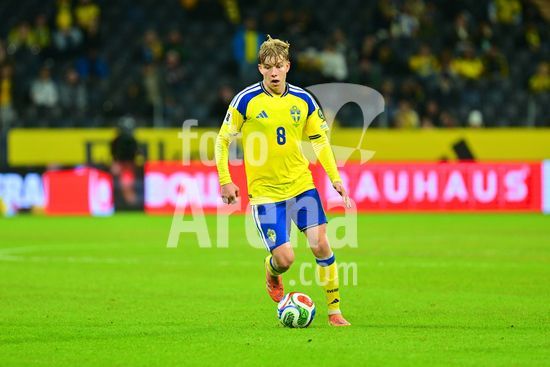 2844641 Mattias Svanberg (19 anos, Suecia) durante o jogo das Eliminatorias da Copa do Mundo da FIFA, em 18 de novembro de 2025, entre Suecia e Eslovenia, na Strawberry Arena, em Solna, Suecia. (Peter Sonander/SPP)