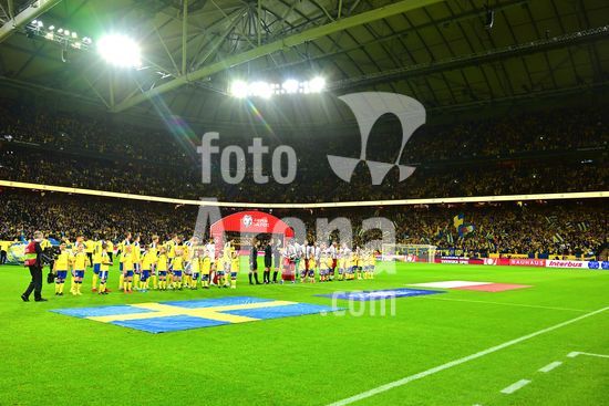 2915842 Strawberry Arena, SOLNA, SUECIA - 31 DE MARCO: as duas equipes alinhadas antes da partida de qualificacao para a Copa do Mundo de 2026 entre Suecia e Polonia na Strawberry Arena em 31 de marco de 2026 em Solna, Suecia. (Peter Sonander/SPP)