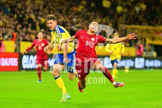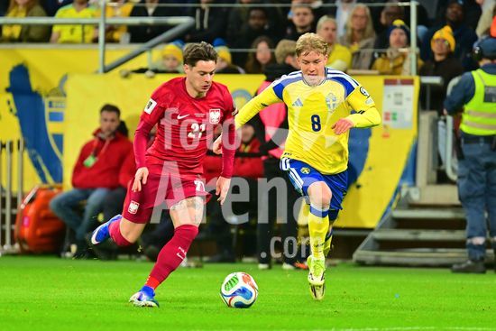 2915843 Strawberry Arena, SOLNA, SUECIA - 31 DE MARCO: Oskar Pietuszewski, da Polonia, e Daniel Svensson, da Suecia, disputam a bola durante a partida de qualificacao para a Copa do Mundo de 2026 entre Suecia e Polonia, na Strawberry Arena, em 31 de marco de 2026, em Solna, Suecia. (Peter Sonander/SPP)