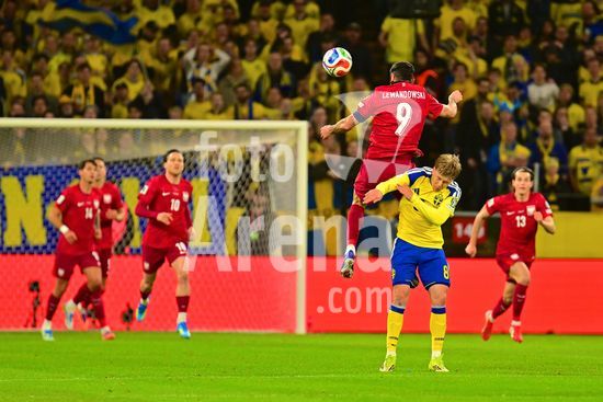 2915825 Strawberry Arena, SOLNA, SUECIA - 31 DE MARCO: Robert Lewandowski, da Polonia, e Gustaf Lagerbielke, da Suecia, durante a partida de qualificacao para a Copa do Mundo de 2026 entre Suecia e Polonia, na Strawberry Arena, em 31 de marco de 2026, em Solna, Suecia. (Peter Sonander/SPP)