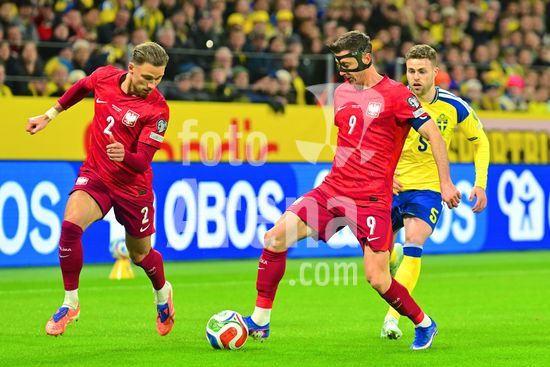 2915847 Strawberry Arena, SOLNA, SUECIA - 31 DE MARCO: Robert Lewandowski, da Polonia, Matty Cash, da Polonia, e Gabriel Gudmundsson, da Suecia, durante a partida de qualificacao para a Copa do Mundo de 2026 entre Suecia e Polonia, na Strawberry Arena, em 31 de marco de 2026, em Solna, Suecia. (Peter Sonander/SPP)