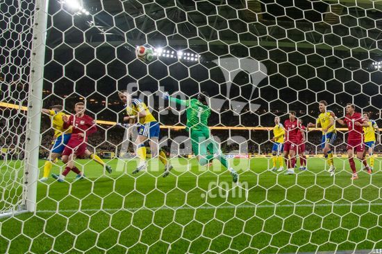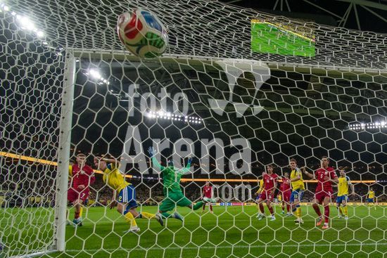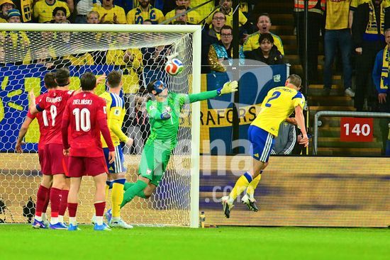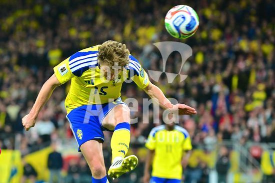 2915871 Strawberry Arena, SOLNA, SUECIA - 31 DE MARCO: Gustaf Lagerbielke, da Suecia, marca de cabeca na partida de qualificacao para a Copa do Mundo de 2026 entre Suecia e Polonia, na Strawberry Arena, em 31 de marco de 2026, em Solna, Suecia. (Peter Sonander/SPP) (Peter Sonander/SPP)