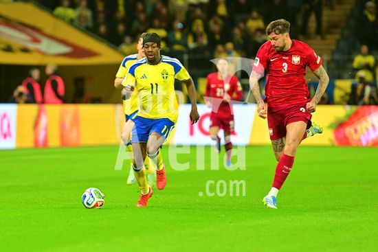 2915865 Strawberry Arena, SOLNA, SUECIA - 31 DE MARCO: Anthony Elanga, da Suecia, e Przemyslaw Wisniewski, da Polonia, durante a partida de qualificacao para a Copa do Mundo de 2026 entre Suecia e Polonia, na Strawberry Arena, em 31 de marco de 2026, em Solna, Suecia. (Peter Sonander/SPP)