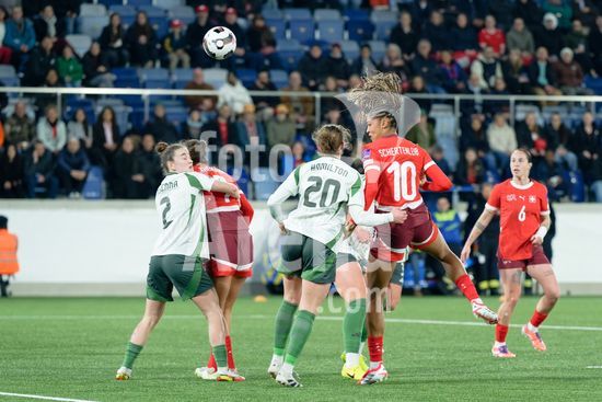 2897152 Lausanne, Suica - 3 de marco: Sydney Schertenleib, da Suica, salta para cabecear sob pressao de Caragh Hamilton, da Irlanda do Norte, durante a partida das Eliminatorias da Copa do Mundo Feminina da FIFA 2027 entre Suica e Irlanda do Norte, no Stade de la Tuiliere, em 3 de marco de 2026, em Lausanne, Suica. (Giuseppe Velletri/SPP)