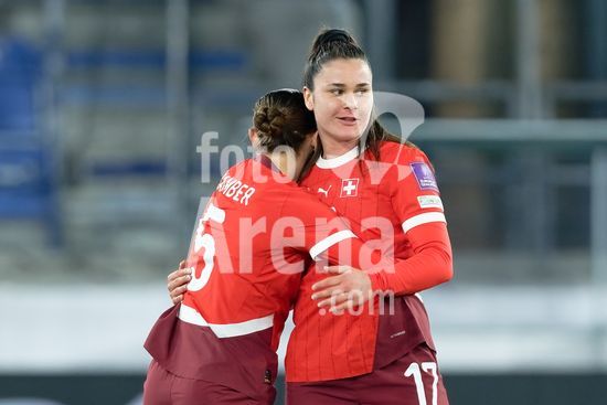 2897195 Lausanne, Suica - 3 de marco: Svenja Folmli e Viola Calligaris comemoram o segundo gol durante a partida das Eliminatorias da Copa do Mundo Feminina da FIFA 2027 entre Suica e Irlanda do Norte, no Estadio La Tuiliere, em Lausanne, Suica. (Carla Botica/SPP)