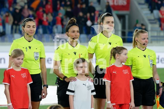 2897169 Lausanne, Suica - 3 de marco: Amina Gutschi, arbitra assistente, Shona Shukrula, arbitra principal, Manon Plandsoen, quarta arbitra, e Amina Gutschi, arbitra assistente, durante a partida das Eliminatorias da Copa do Mundo Feminina da FIFA 2027 entre Suica e Irlanda do Norte no Stade de la Tuiliere, em 3 de marco de 2026, em Lausanne, Suica. (Giuseppe Velletri/SPP)