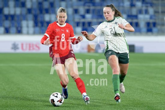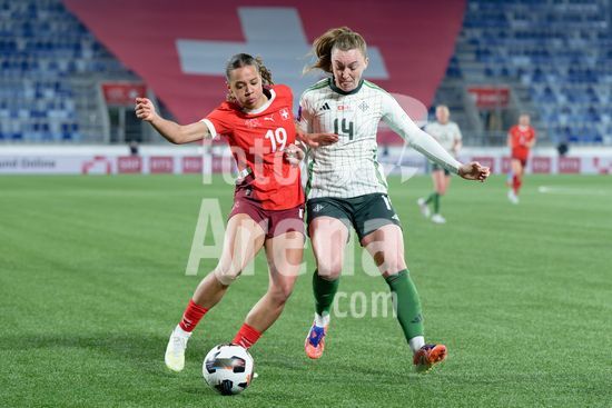 2897154 Lausanne, Suica - 3 de marco: Duelo entre Laura Rafferty, da Irlanda do Norte, e Iman Beney, da Suica, durante a partida das Eliminatorias da Copa do Mundo Feminina da FIFA 2027 entre Suica e Irlanda do Norte, no Estadio La Tuiliere, em Lausanne, Suica. (Carla Botica/SPP)