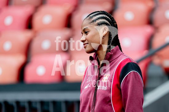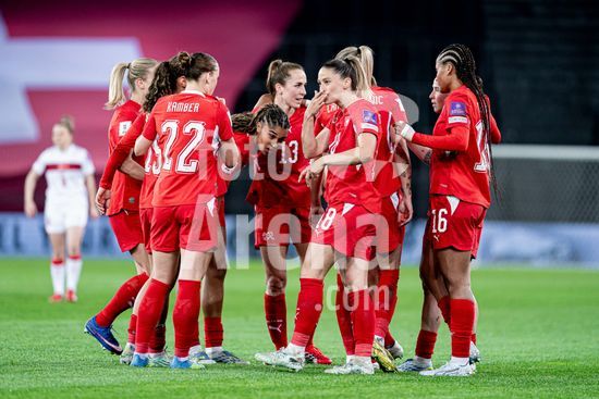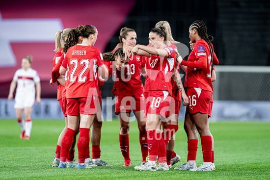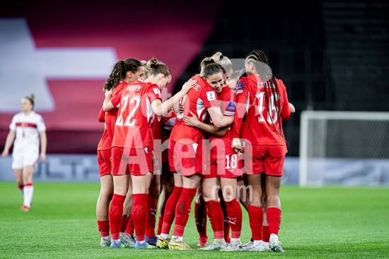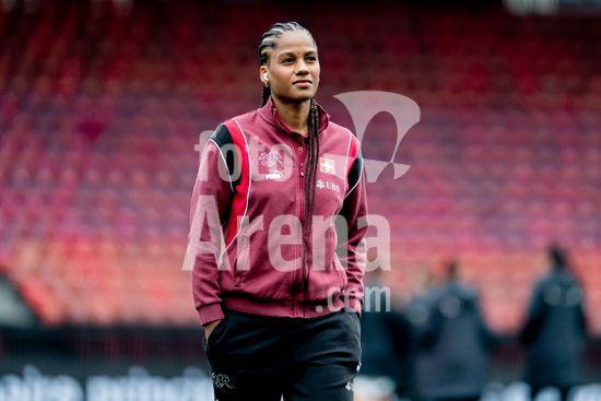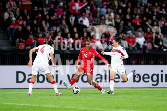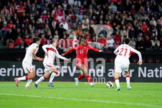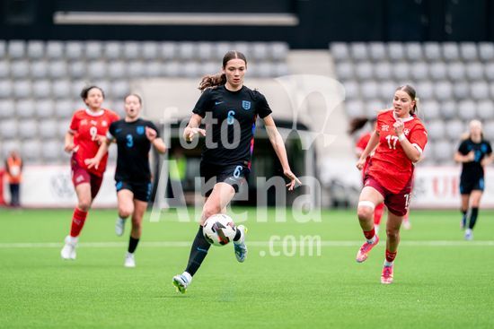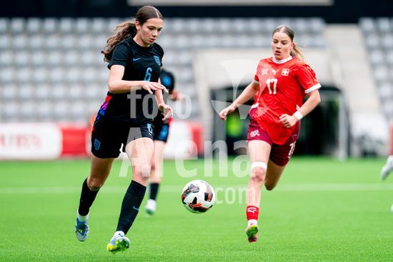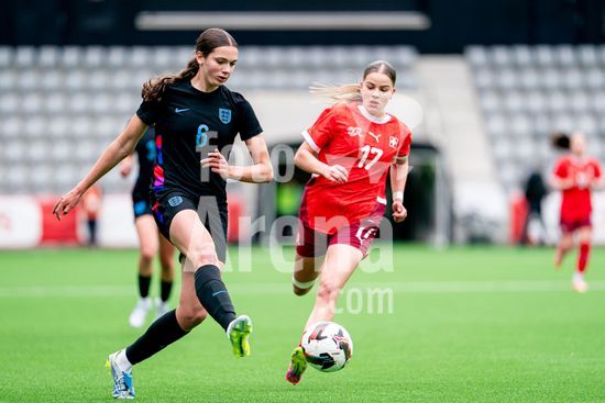 VEVEY, SUICA - 15 DE ABRIL: Rahel Hinder (17 Suica), a direita, e Cecily Wellesley-Smith (6 Inglaterra), a esquerda, em acao durante a partida de qualificacao para o Campeonato Europeu Feminino Sub-19 da UEFA entre Suica e Inglaterra na Tissot Arena em 15 de abril de 2026 em Biel, Suica. (Priscila Bütler / SPP)