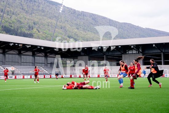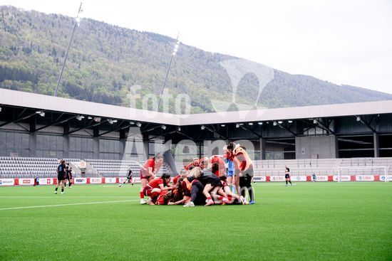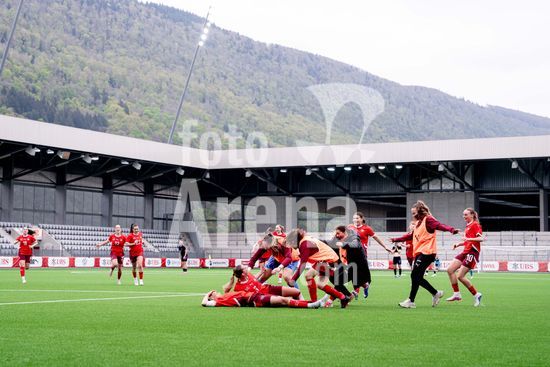 VEVEY, SUICA - 15 DE ABRIL: Jogadoras da Suica comemorando o segundo gol da equipe, marcado por Emanuela Pfister (9 Suica), durante a partida de qualificacao para o Campeonato Europeu Feminino Sub-19 da UEFA entre Suica e Inglaterra, na Tissot Arena, em 15 de abril de 2026, em Biel, Suica. (Priscila Bütler / SPP)