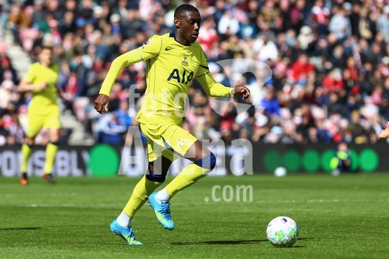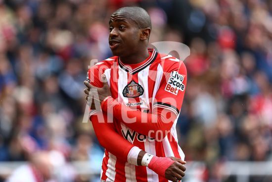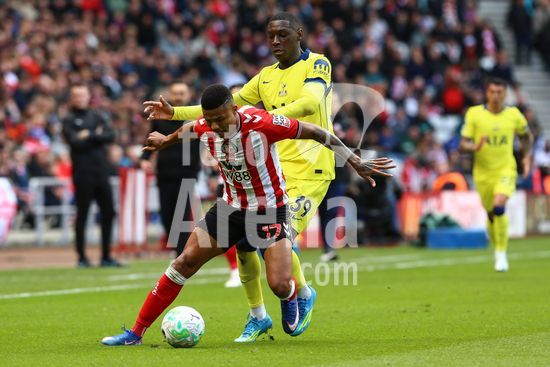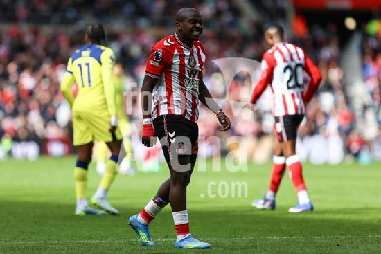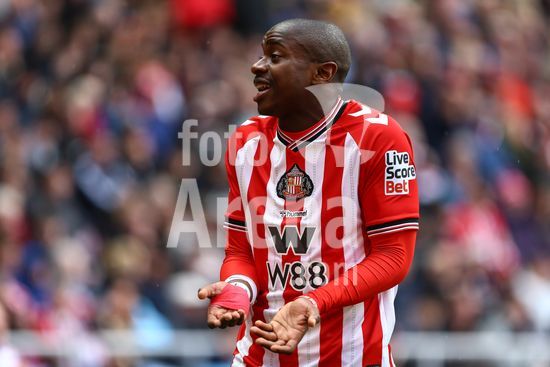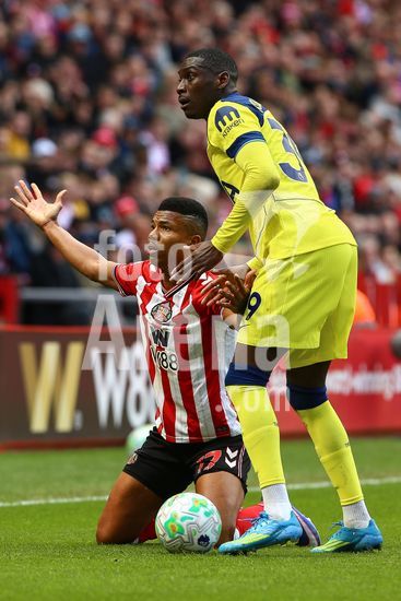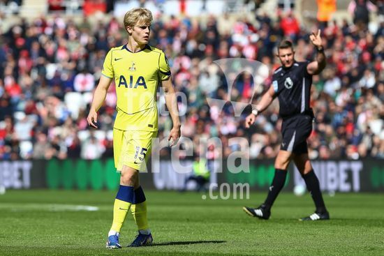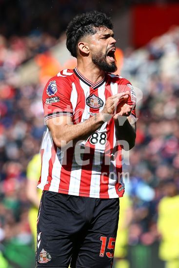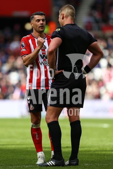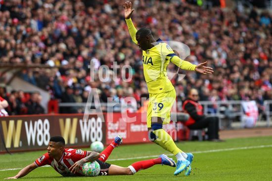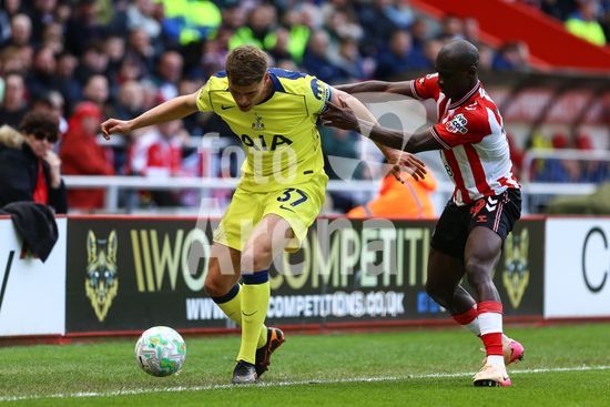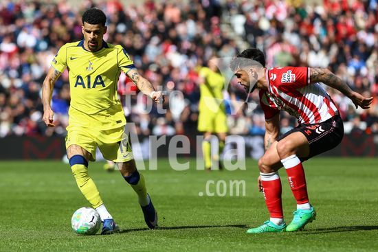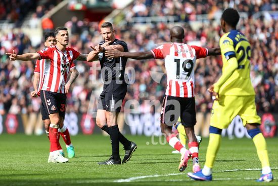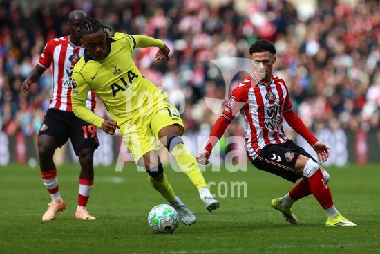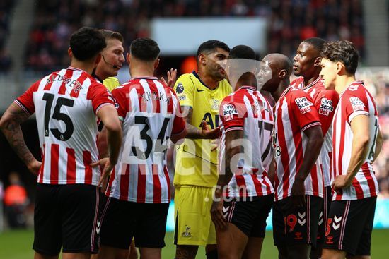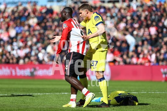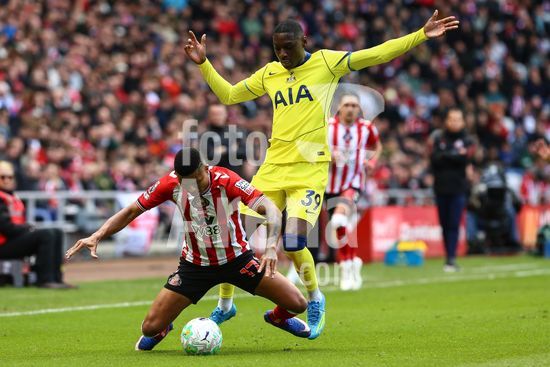 SUNDERLAND, INGLATERRA, 12 DE ABRIL: Jogadores do Sunderland cercam o arbitro Robert Jones apos uma falta em Randal Kolo Muani, do Tottenham Hotspur, durante uma partida da Premier League 2025-26 entre Sunderland e Tottenham Hotspur no Stadium of Light, em 12 de abril de 2026, em Sunderland, Inglaterra. (Foto de Zach Forster/Sports Press Photo) (Zach Forster/Sports Press Photo / SPP)