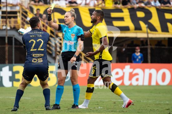2873039 Árbitra Mariana Nanni Batalha dá cartão amarelo a Walter durante a partida entre São Bernardo x Mirassol, válida pela 5ª rodada do Paulistão, realizada na tarde deste sábado (24) no Estádio Primeiro de Maio em São Bernardo do Campo, SP.