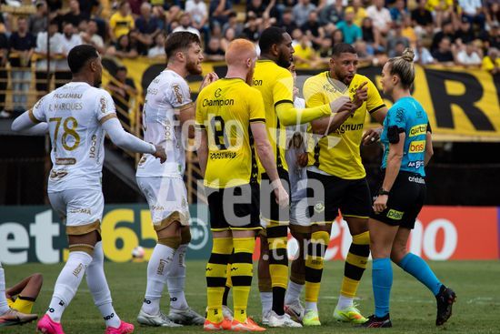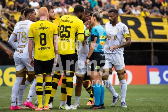 2873044 Jogadores discutem com a árbitra Mariana Nanni Batalha durante a partida entre São Bernardo x Mirassol, válida pela 5ª rodada do Paulistão, realizada na tarde deste sábado (24) no Estádio Primeiro de Maio em São Bernardo do Campo, SP.