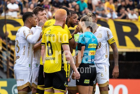 2873045 Jogadores discutem com a árbitra Mariana Nanni Batalha durante a partida entre São Bernardo x Mirassol, válida pela 5ª rodada do Paulistão, realizada na tarde deste sábado (24) no Estádio Primeiro de Maio em São Bernardo do Campo, SP.