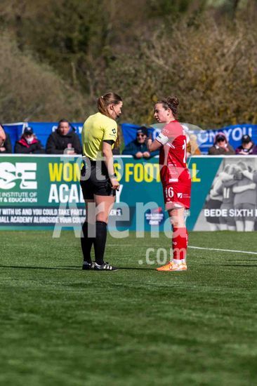 2919384 Emily Syme (16 Bristol City) questiona a arbitra sobre a decisao do penalti durante o jogo da Barclays WSL2 entre Durham e Bristol City, em Maiden Castle, em 5 de abril de 2026, em Durham, Inglaterra. (Clare Overfield / SPP)