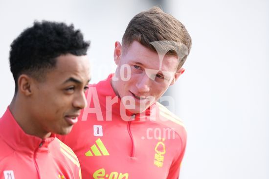 2875001 Elliot Anderson e Omari Hutchinson, do Nottingham Forest, durante o dia de imprensa do Nottingham Forest e do Ferencvarosi TC. (Paul Bonser/Sports Press Photo / SPP)