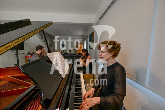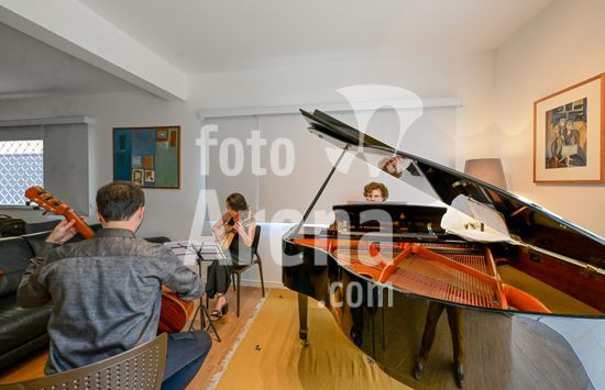2879835 Trio Maciar faz ensaio para apresentação no Sesc o Trio Maciar é composto pela musicista Raquel Aranha bandolim , Rosana Civile no piano e Bruno Madeira no violão .