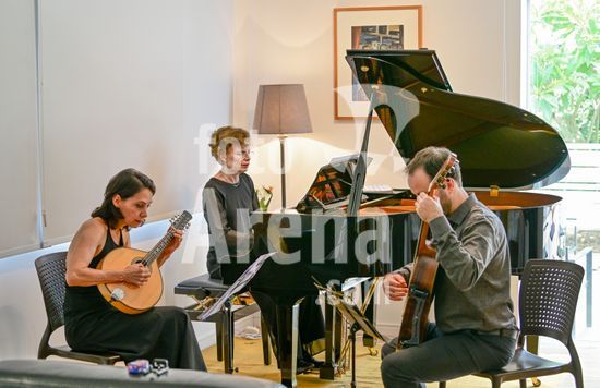 2879829 Trio Maciar faz ensaio para apresentação no Sesc o Trio Maciar é composto pela musicista Raquel Aranha bandolim , Rosana Civile no piano e Bruno Madeira no violão .