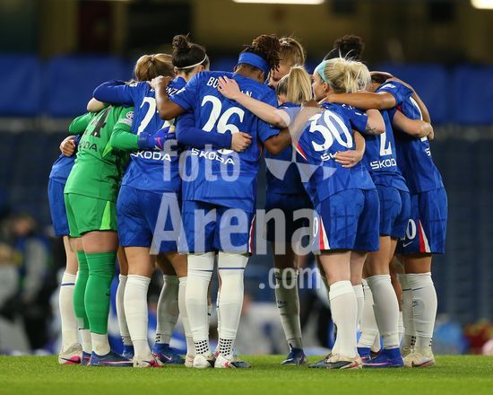 2916720 LONDRES, INGLATERRA - 1 DE ABRIL: Jogadoras do Chelsea reunidas antes do pontape inicial da partida de volta das quartas de final da Liga dos Campeoes Feminina da UEFA 2025/26 entre Chelsea e Arsenal, no Stamford Bridge, em 1 de abril de 2026, em Londres, Inglaterra. (Jay Patel/SPP)