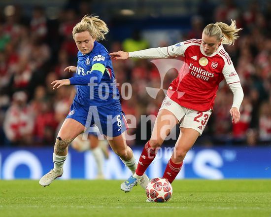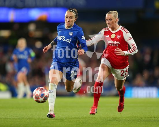 2916723 LONDRES, INGLATERRA - 1 DE ABRIL: Lucy Bronze, do Chelsea, e perseguida por Stina Blackstenius, do Arsenal, durante a partida de volta das quartas de final da Liga dos Campeoes Feminina da UEFA 2025/26 entre Chelsea e Arsenal, no Stamford Bridge, em 1 de abril de 2026, em Londres, Inglaterra. (Jay Patel/SPP)