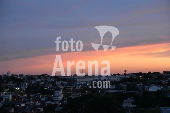 2825488 Imagem de clima tempo, com céu claro no início da noite, com pôr do sol alaranjado. Tempo seco, pouco vento. A cor mais alaranjada do que o comum ocorre porque a frequência vermelha, emitida pelo Sol, tem menor interação com as partículas de poluição, como poeira e fumaça. Caxias do Sul, RS, (16).