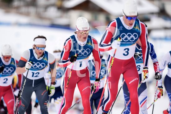 ny210226121613 Martin Loewstroem Nyenget (3) and Johannes Hoesflot Klaebo (1), of Norway, during the 50km mass start cross-country skiing men's competition at the 2026 Milan Cortina Winter Olympics in Lago, Italy, Saturday, Feb. 21, 2026. (Vincent Alban/The New York Times/Fotoarena)